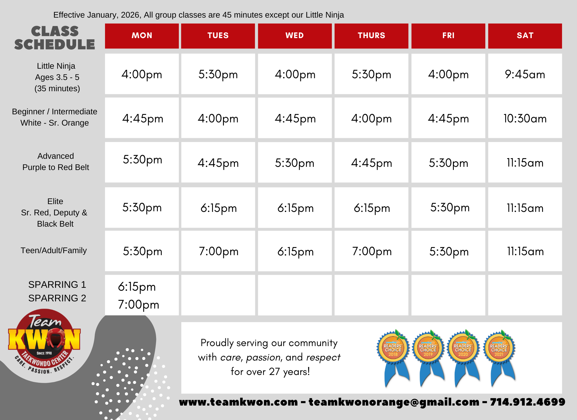 Our Martial Arts Class Schedule